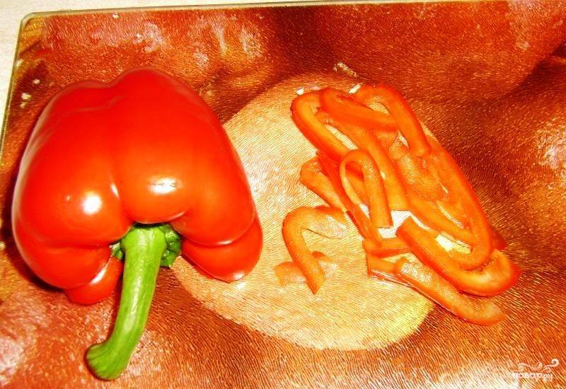 Болгарский перец вымойте, очистите от семян и также нарежьте тонкими ломтиками. Вы можете взять перец зеленого, красного и желтого цвета, чтобы салат выглядел на столе ярко и привлекательно.