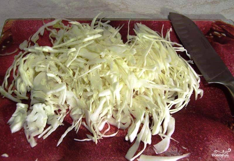Капусту вымойте и нашинкуйте тонкой соломкой. Чтобы она была мягкой, присыпте капусту солью и хорошенько помните руками пока, она не пустит сок.