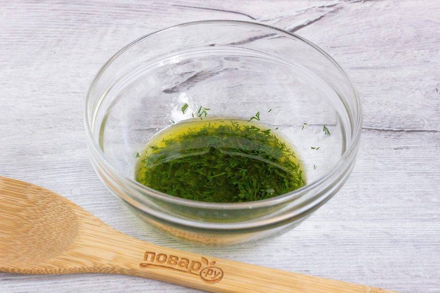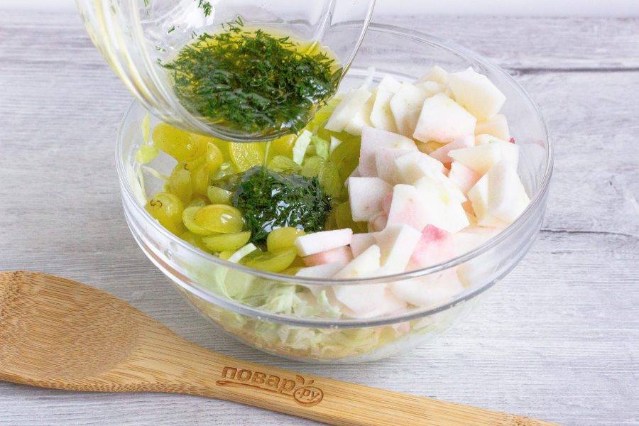 Сначала приготовьте заправку, чтобы она настоялась, пока мы нарежем фрукты и овощи. В миске смешайте рубленную зелень, оливковое масло, лимонный сок. Посолите по вкусу, можно поперчить.