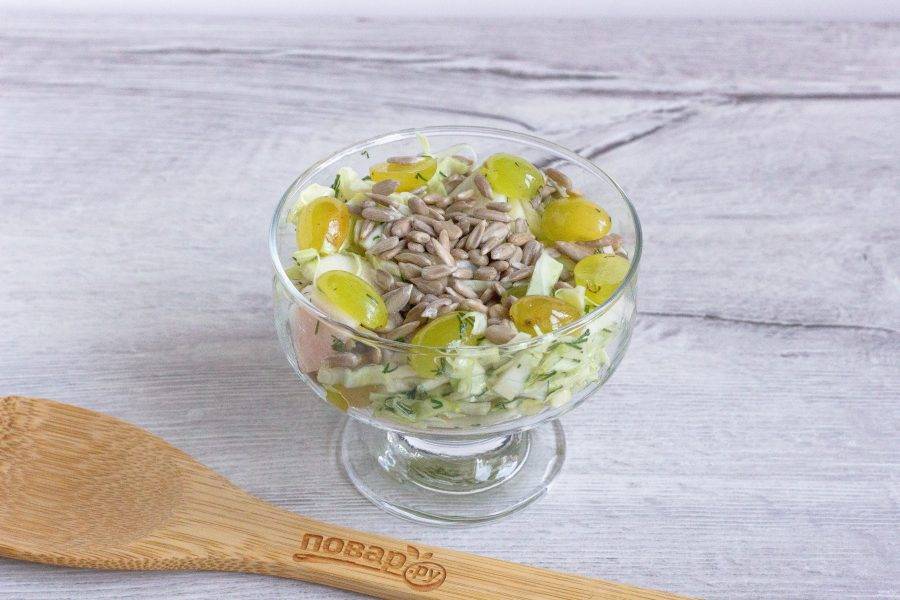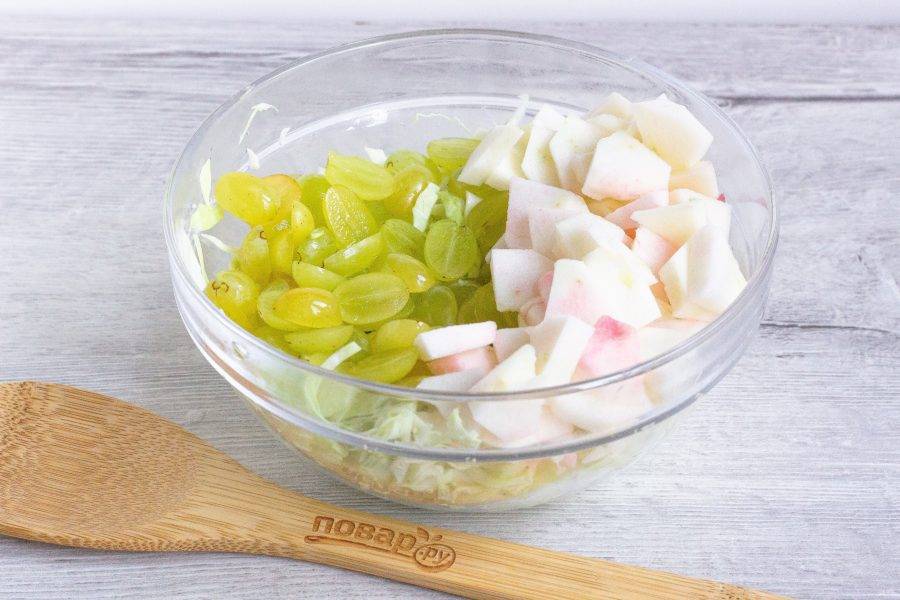Ягоды винограда разрежьте пополам. Яблоки нарезайте в последнюю очередь, чтобы они не потемнели. Очистите их от кожуры и семян, затем нарежьте небольшими кусочками.