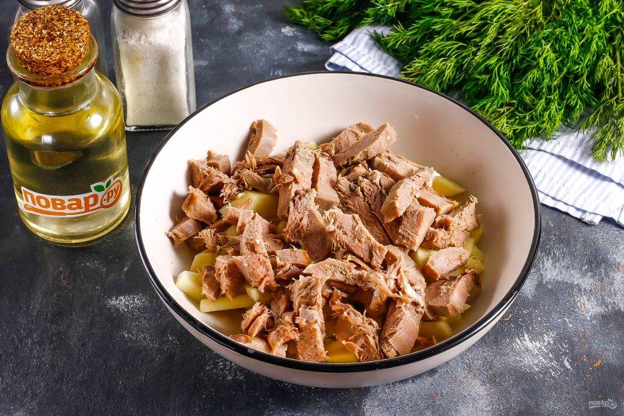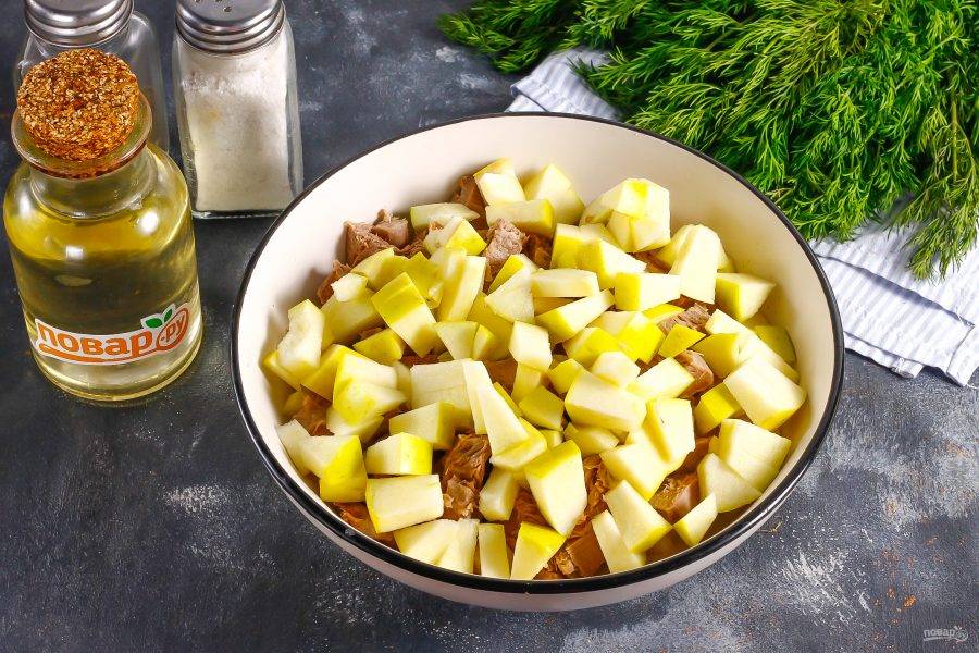 Процедите нарезку сельдерея и выложите в салатник. Охлажденный отварной язык нарежьте брусочками либо кубиками и выложите в емкость.
