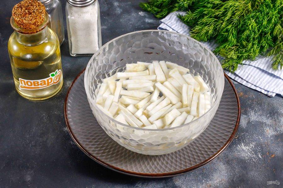 Очистите корневой сельдерей от кожуры, промойте в воде и нарежьте брусочками или кубиками. Высыпьте в глубокую емкость. Влейте туда же 150 мл. теплой воды и яблочный уксус. Оставьте на 10-15 минут, чтобы уксус вытянул горечь овоща.