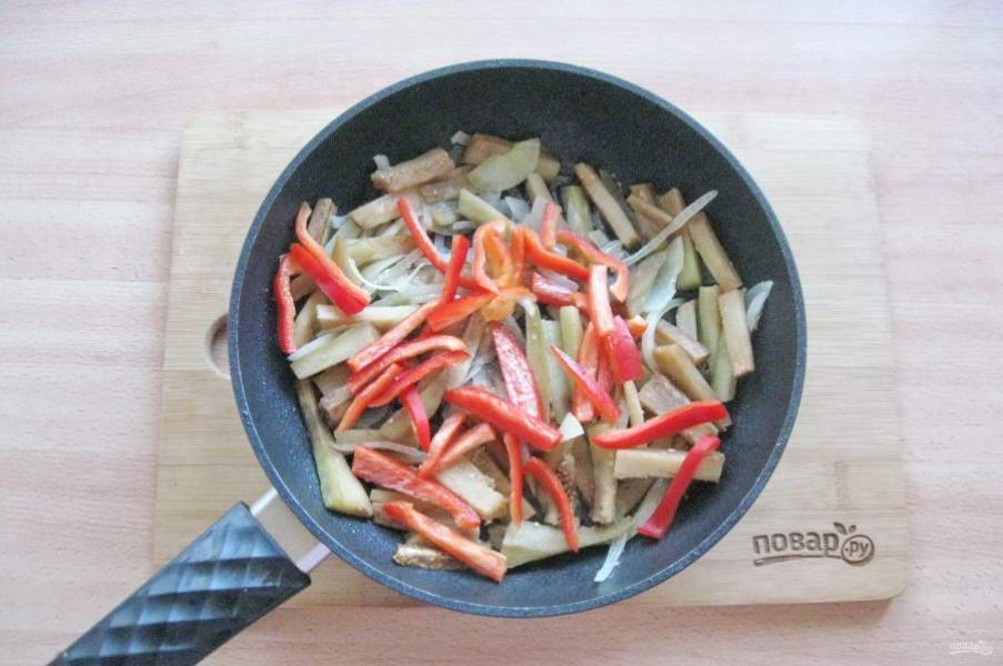 Болгарский перец очистите от семян и помойте. Нарежьте соломкой и выложите в сковороду с баклажаном и луком.