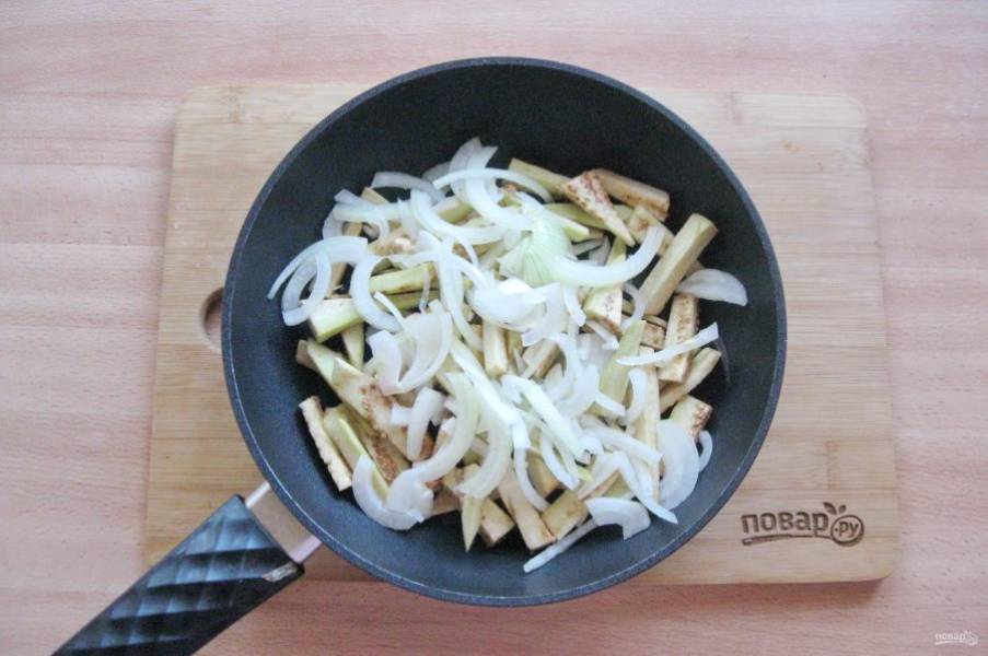 Репчатый лук очистите, помойте и нарежьте полукольцами. Добавьте в сковороду с баклажаном.