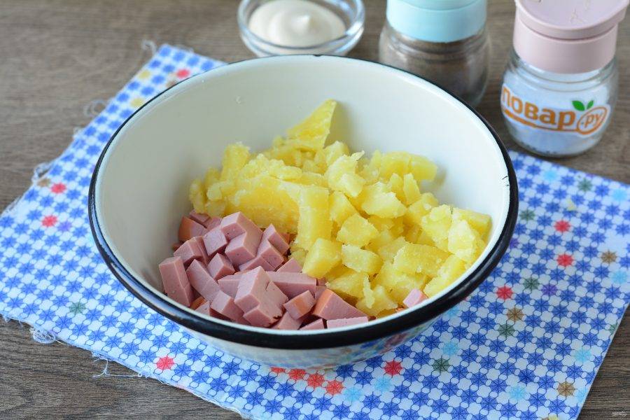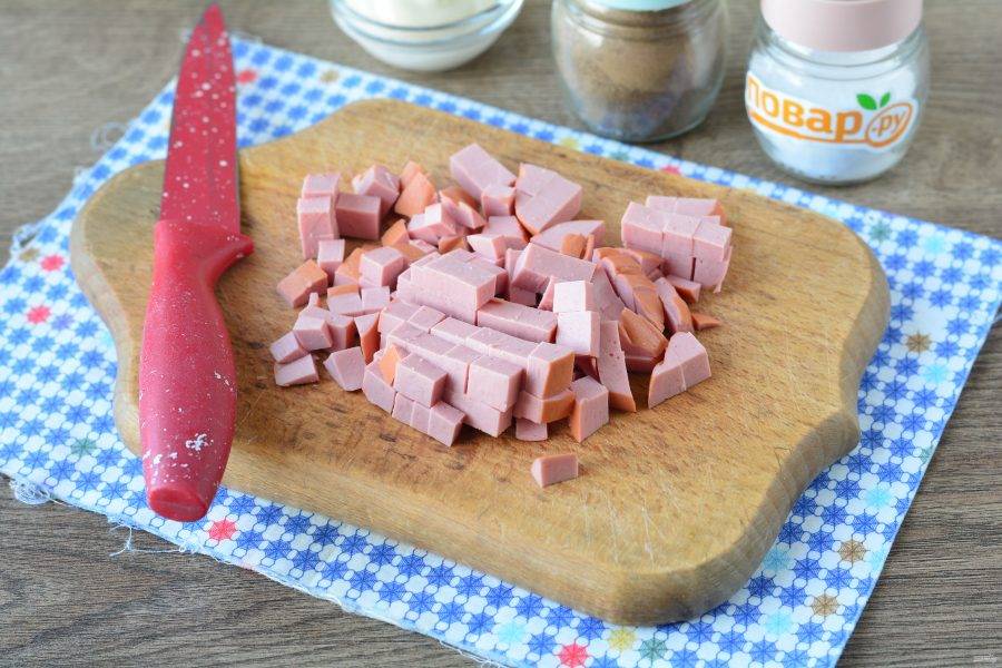 Нарежьте кубиками вареную колбасу.