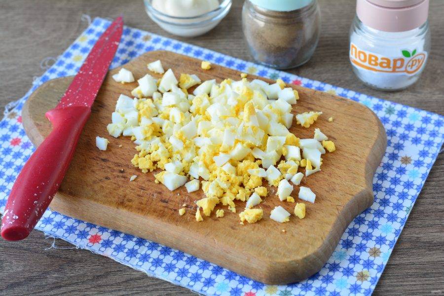 Сваренные вкрутую яйца нарежьте кубиками.