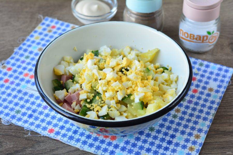 Всыпьте нарезанные яйца в салат.