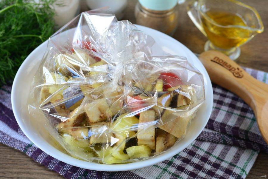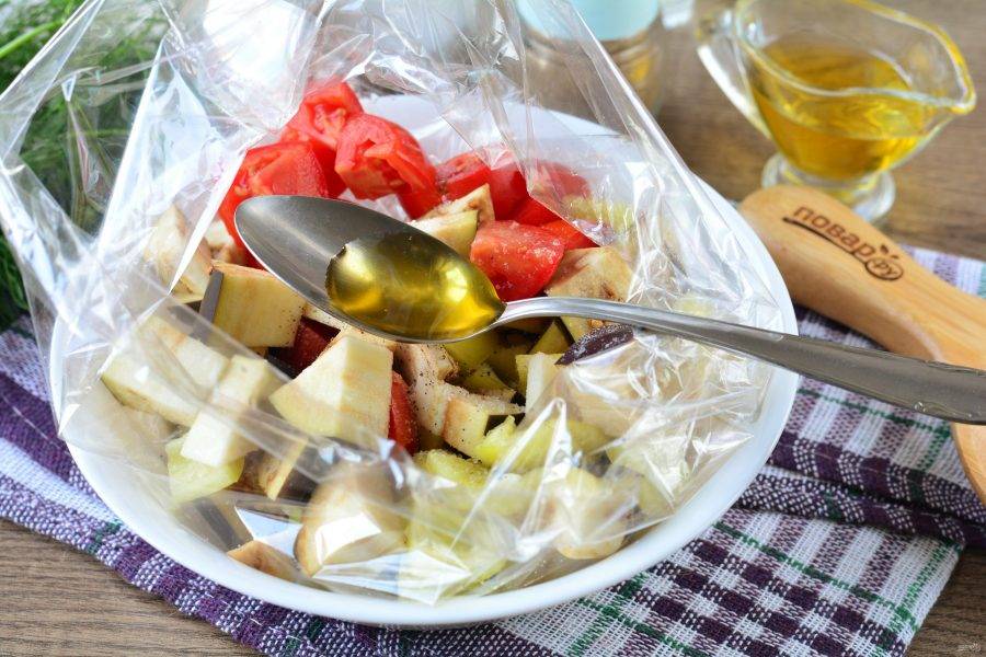 Все овощи сложите в пакет для запекания. Туда же всыпьте соль, сахар и черный молотый перец.