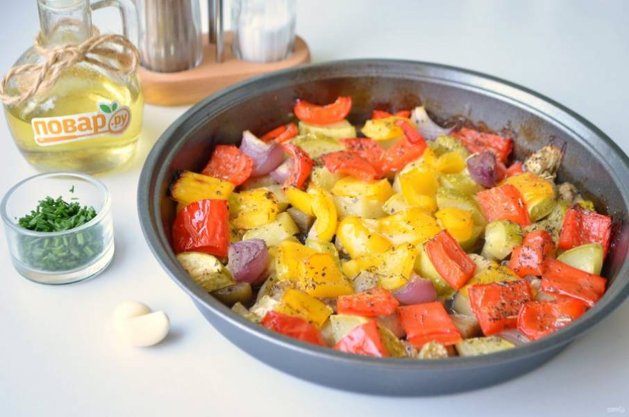 5. Все овощи сложите в удобный жаропрочный противень, посолите, поперчите, притрусите прованскими травами и сбрызните растительным маслом. По краю влейте чуточку воды, чтобы овощи не пригорели и были сочные. Отправьте в духовку на 30 минут, накрыв фольгой.