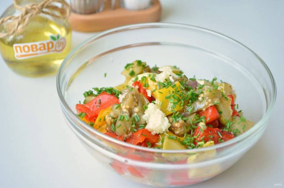 7. Готовые овощи переложите в тарелку, добавьте чеснок (пропущенный через пресс) и зелень. Масло лить не нужно, его достаточно, лишнее пусть останется на дне противня. Перемешайте. Салат готов. Можно кушать как в теплом, так и холодном виде.