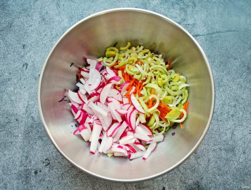 Белую часть лука порея разрежьте вдоль и порежьте. У редиса отрежьте кончики и порежьте крупной соломкой. Выложите овощи в миску с капустой и морковью.
