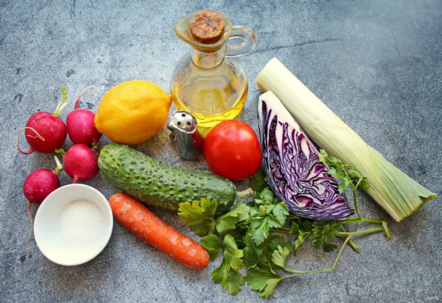 Подготовьте все необходимые ингредиенты для приготовления салата "Живой". Овощи тщательно вымойте, обсушите и при необходимости почистите.