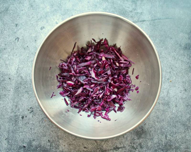 У краснокочанной капусты удалите кочерыжку и порежьте тонкой соломкой. Посыпьте немного сахаром и солью, слегка помните, чтобы она стала помягче, а можете вообще этого не делать.