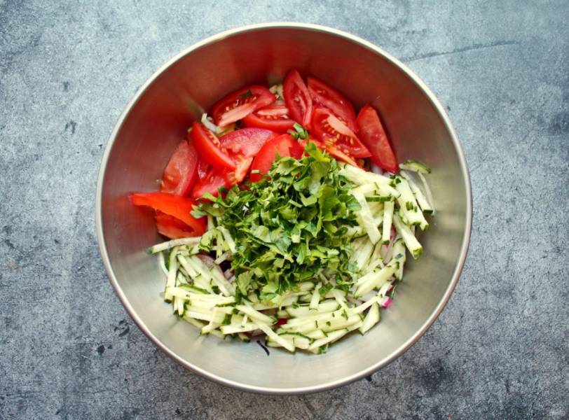 Свежий огурец порежьте средней соломкой, а помидоры дольками. Выложите их к овощам.