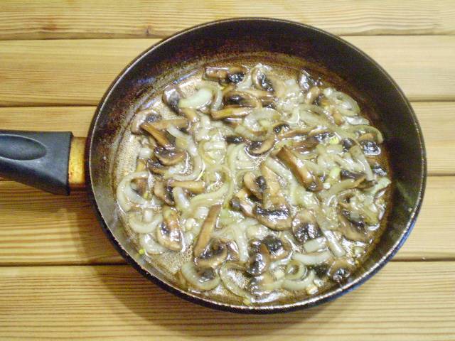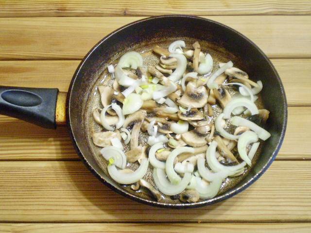 3. Лук и грибы обжарить до готовности на сковороде на среднем огне с добавлением минимального количества масла.