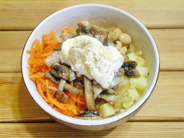 8. Добавьте грибы и лук в салат. Заправьте майонезом, посолите, поперчите.