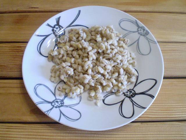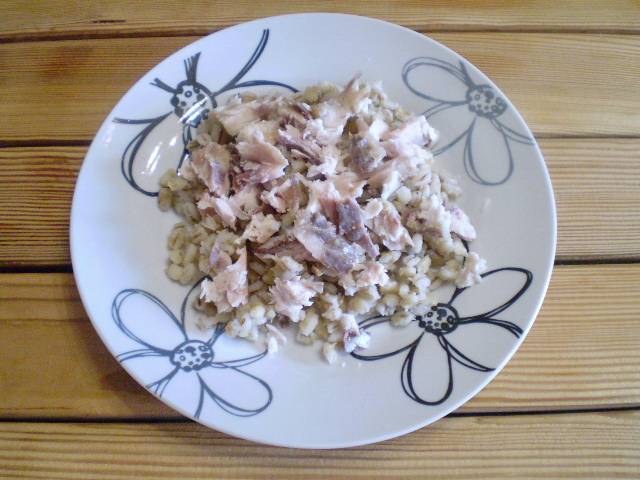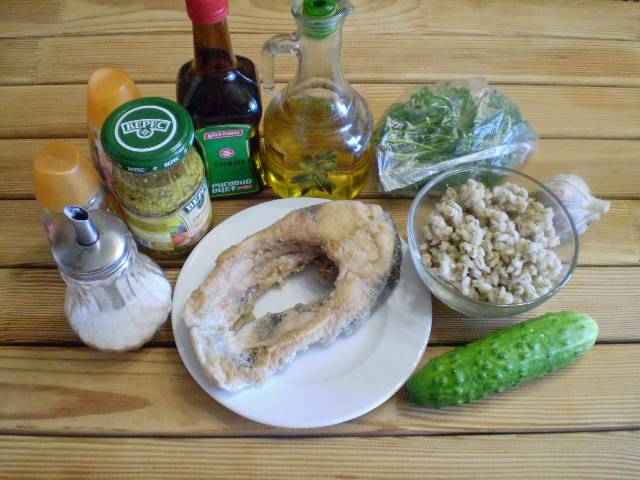1. Приготовим продукты. Перловую крупу заранее отварить, остудить. Рыбу пожарить или отварить до готовности.