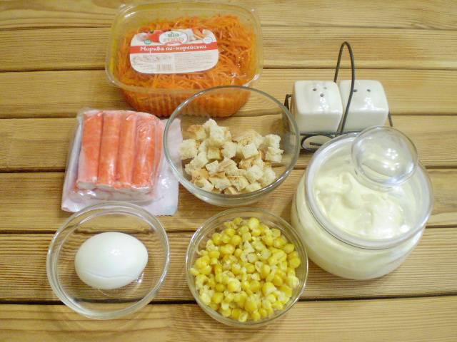1. Приготовим продукты. Яйцо отварить до готовности, очистить. Сухарики можно использовать как домашние, так и покупные.