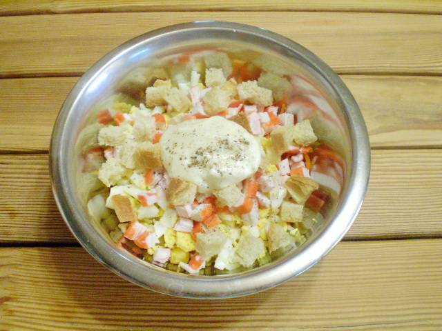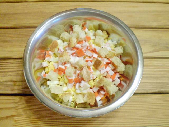 5. Сложить все ингредиенты в салатник, добавить сухарики.