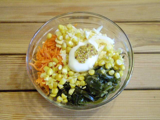 5. Все ингредиенты салата сложить в салатник, заправить майонезом, добавить горчицу, специи.