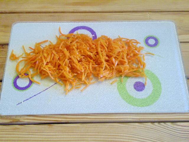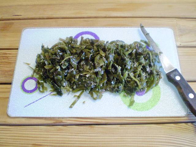 2. Ламинарию лучше порезать, чтоб легче перемешать салат.