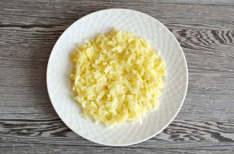 На блюдо натрите вареный картофель. Смажьте майонезом.