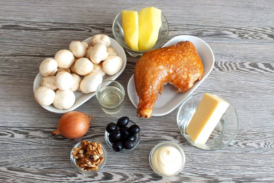 Салат "Кабриолет" оценят любители сытных блюд. В его состав входит копчёная курочка, которая отлично сочетается с грибами и грецкими орехами. Такой салат хорошо подойдёт на праздничный стол. Готовим!