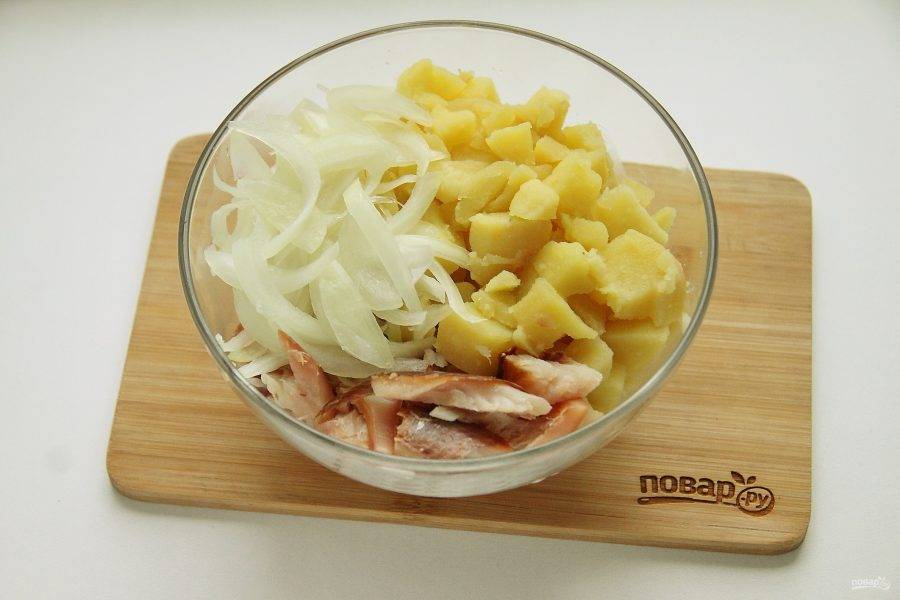 Соедините в глубокой миске или салатнике рыбу, картофель и отжатый от воды лук.