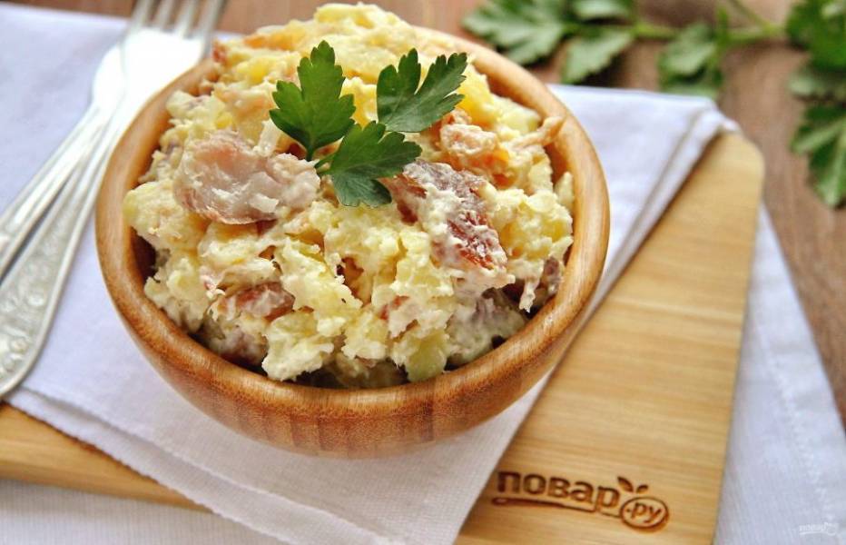 Добавьте майонез и все хорошо перемешайте. В процессе картофель немного помните вилкой, чтобы салат принял более однородную структуру.