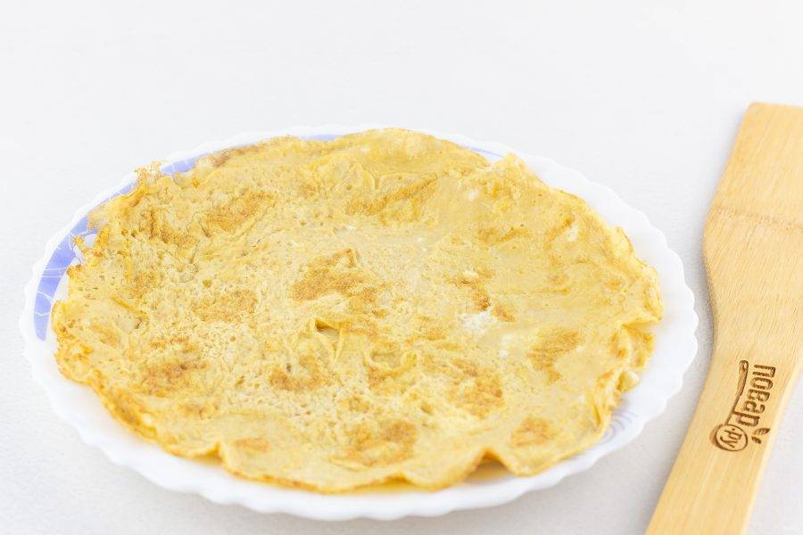 Сковороду смажьте оливковым маслом и приготовьте омлет-блинчик, обжаривая с двух сторон.