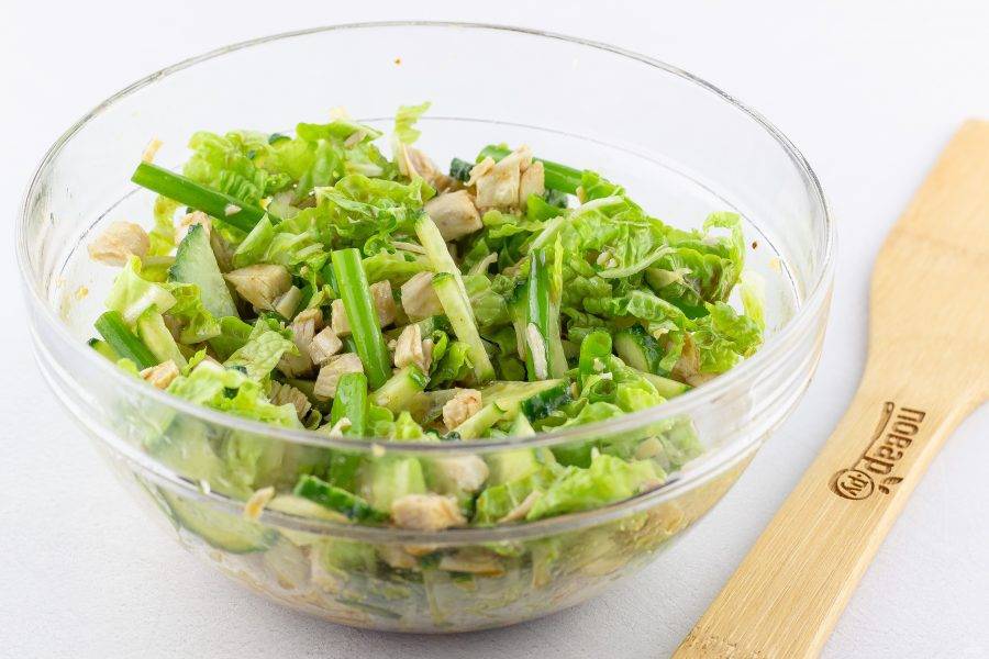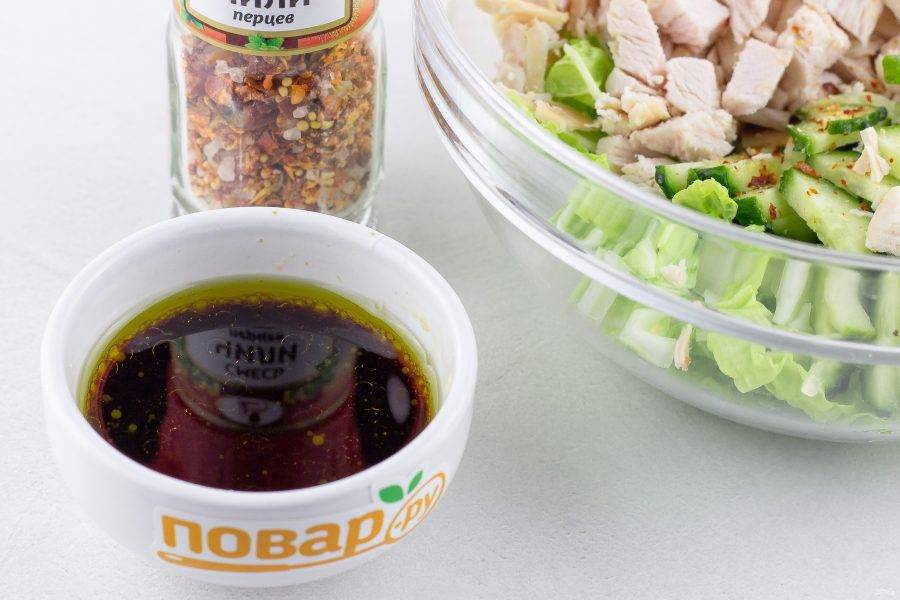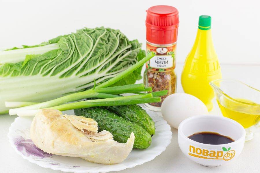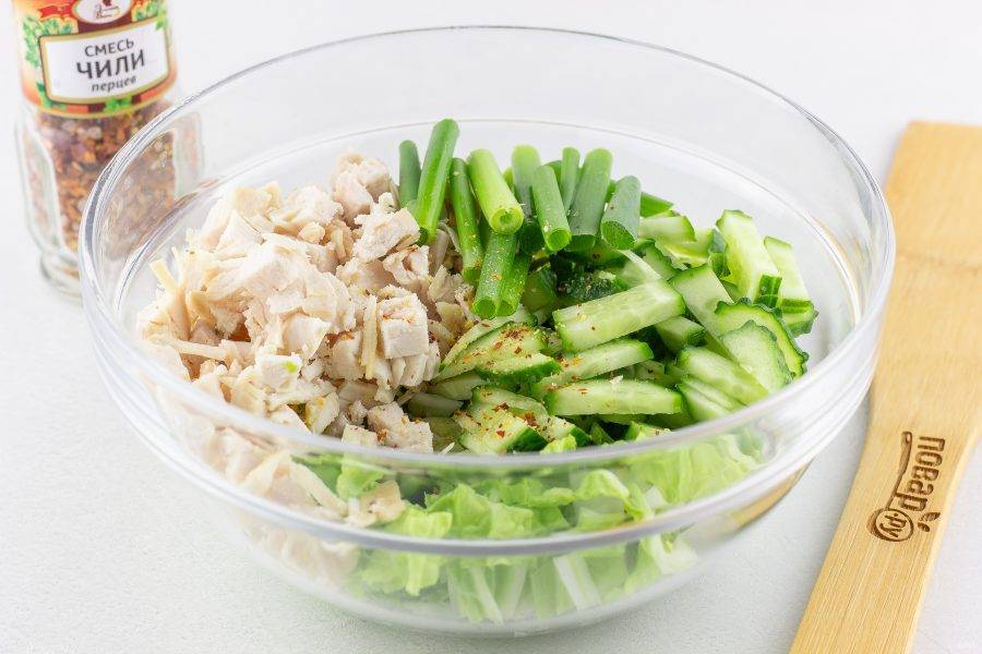 2-3 листа пекинской капусты и огурец нарежьте соломкой, зеленый лук нарежьте крупными брусочками, куриное филе нарежьте кубиками. Выложите всё в салатник и добавьте сухой или свежий перец чили по вкусу.