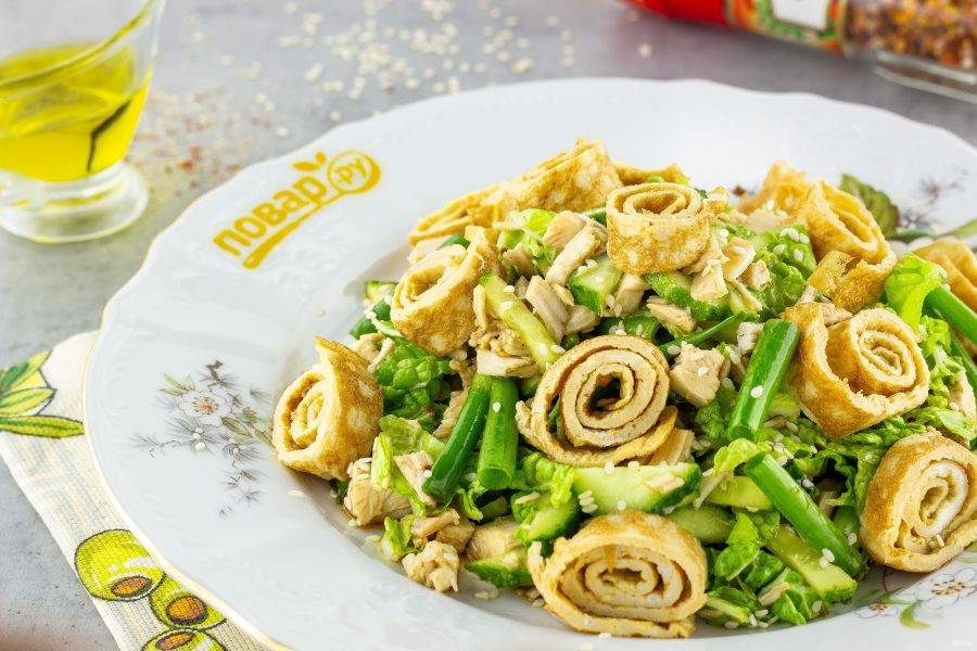 Заправьте салат соусом и дайте постоять 5-10 минут, затем выложите на блюдо и украсьте блинчиками. Блинчики также можно вмешать в основную массу салата.