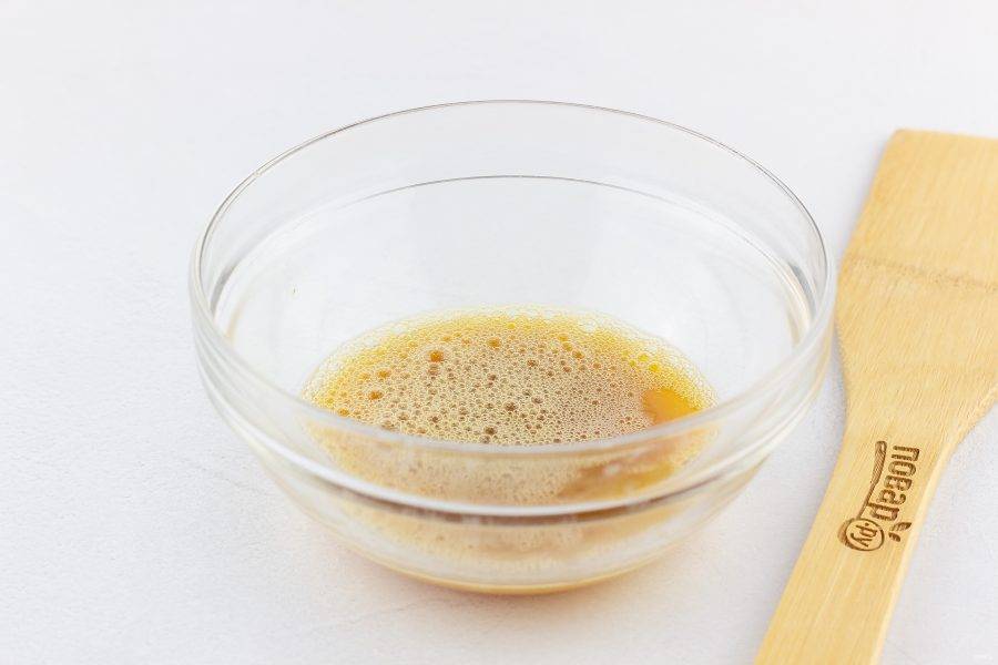 Яйцо взбейте вилкой с 1 ч. л. соевого соуса, щепоткой сахара и 0,5 ч. л. лимонного сока.