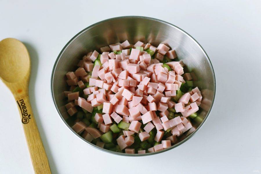 Ветчину нарежьте небольшими кубиками.