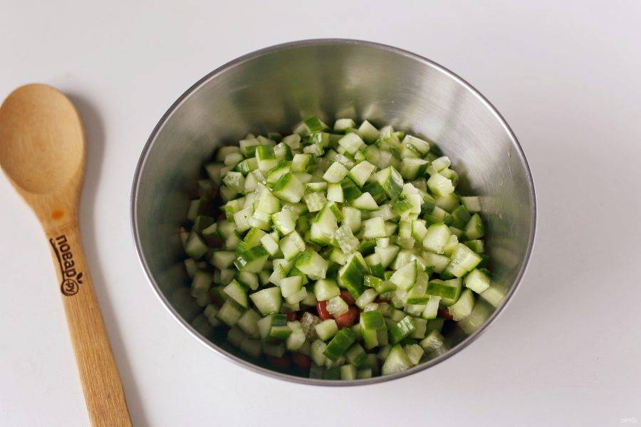 Огурец нарежьте кубиками. У меня огурцы были крупные, хватило одного.