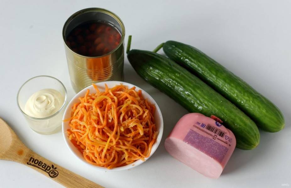 Заправьте салат майонезом и перемешайте. Соль я не добавляю, так как морковь и ветчина уже сами по себе содержат соль.