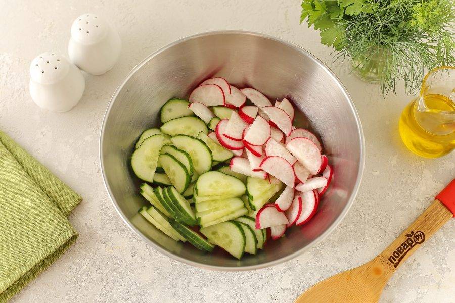 Огурец и редис нарежьте полукружками.