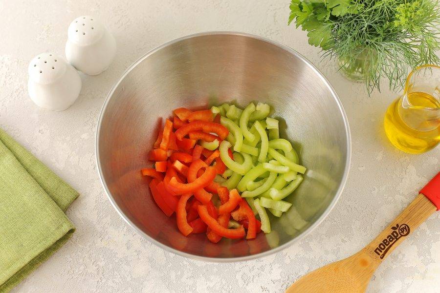 Болгарский перец нарежьте небольшой соломкой.