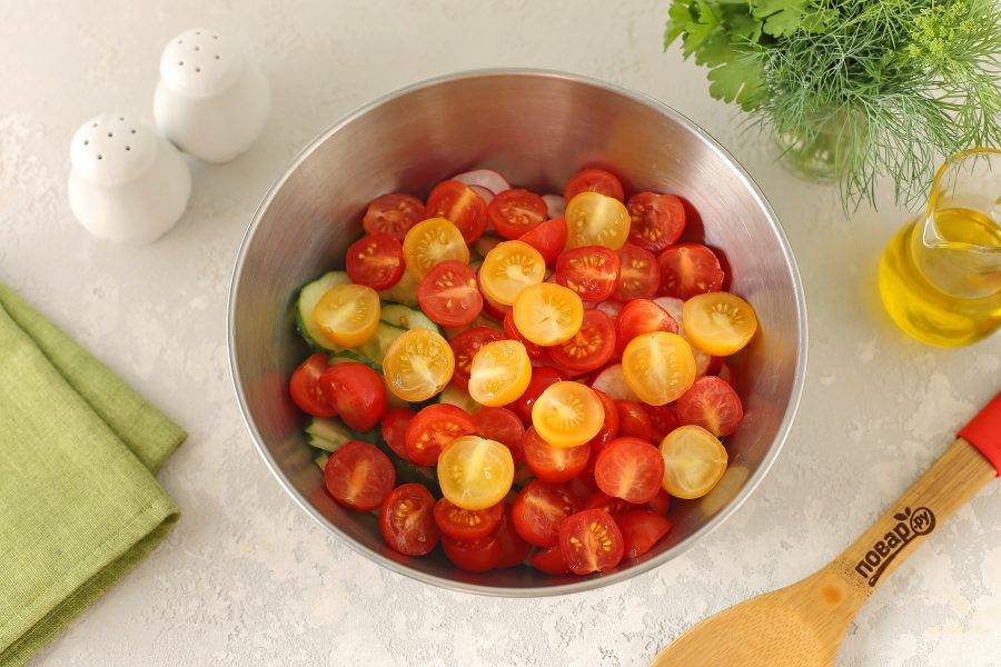 Помидоры черри разрежьте на 2 части.