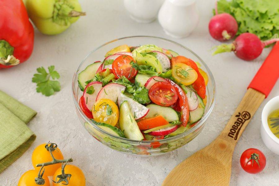 Очень вкусный салат из сезонных овощей. Яркий, сочный и невероятно полезный. Обязательно приготовьте!