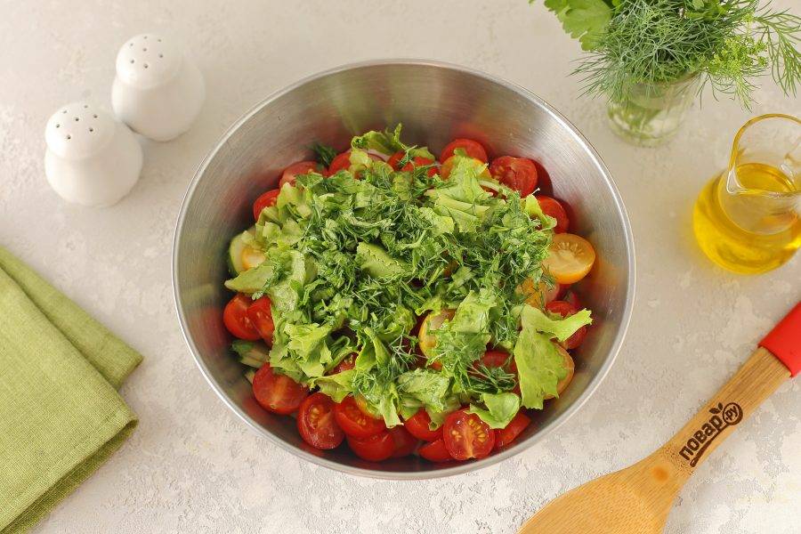 Салат нарвите руками, остальную зелень измельчите ножом.