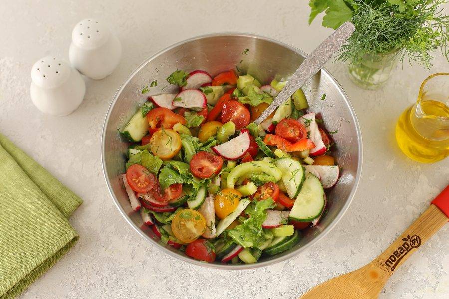 Заправьте салат маслом. Соль и перец добавьте по вкусу. Все хорошо перемешайте.