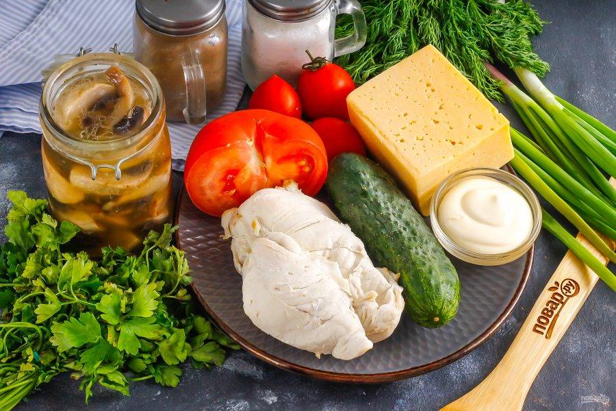 Подготовьте указанные ингредиенты. Куриное филе заранее отварите в воде примерно 30 минут и остудите.