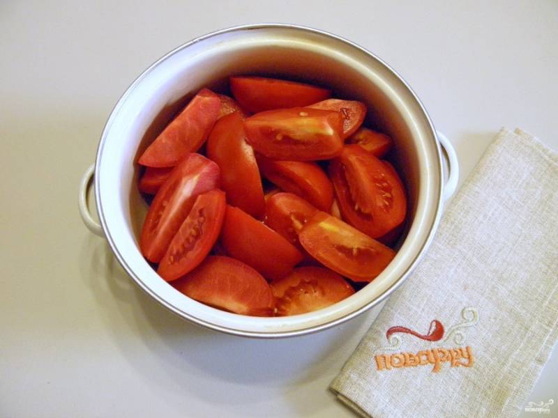 Возьмите удобную антипригарную кастрюлю. Помидоры порежьте на 4 части, слишком большие можно порезать на 6-8 частей. Обязательно вырежьте место крепления плодоножки. Сложите помидоры в кастрюлю.