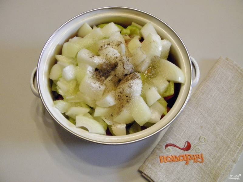 Очищенный лук порежьте квадратами или полукольцами, добавьте к овощам. Салат посолите, добавьте сахар и масло рафинированное, по желанию положите пару щепоток черного перца.