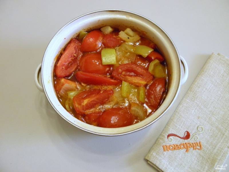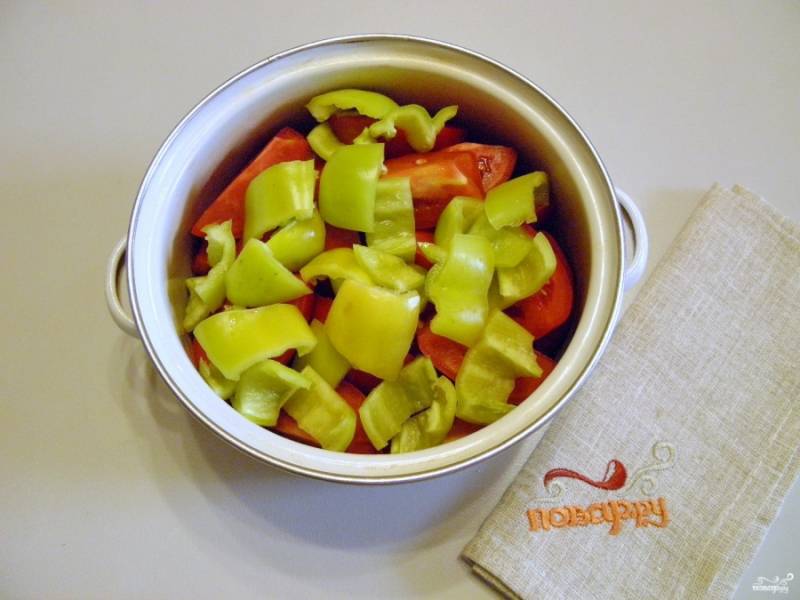 Болгарский перец освободите от семян, помойте внутри и порежьте небольшими квадратами. Добавьте его к помидорам.