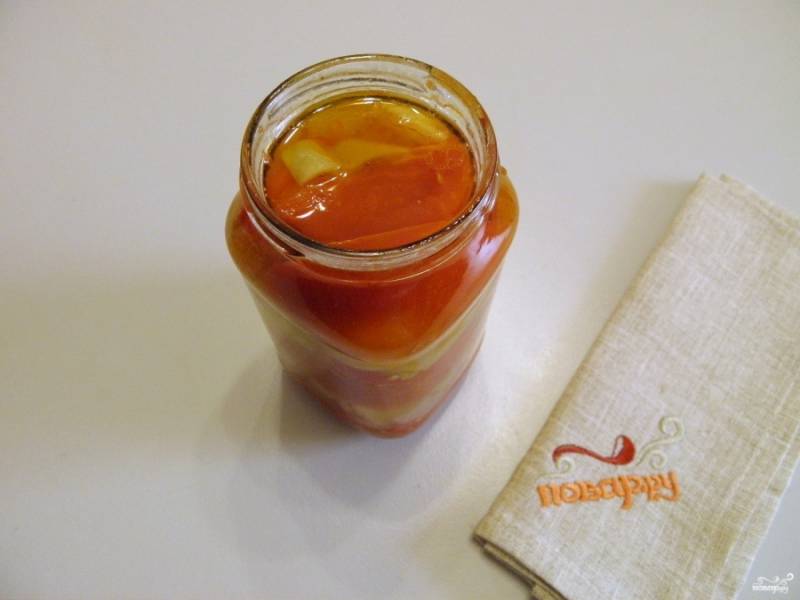 Готовый салат полейте уксусом, встряхните кастрюльку, чтобы уксус разошелся. Разложите осторожно столовой ложкой салат по стерильным баночкам. Закатайте. Переверните вверх дном до полного остывания, после уберите в прохладное место для длительного хранения.