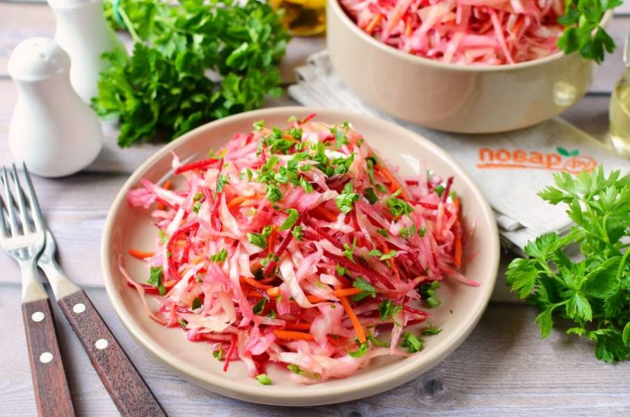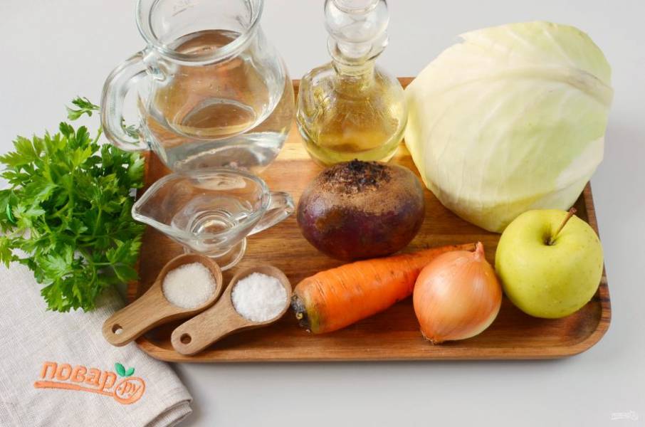 Подготовьте необходимые ингредиенты, очистите лук, морковь и свеклу. Вымойте капусту и яблоко. Петрушка понадобится только для украшения салата. Приступим!