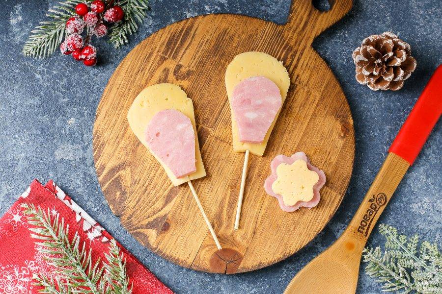 Соедините сырные и ветчинные ушки. К основанию прикрепите зубочистки или шпажки. Если ушки не держатся, то возьмите ещё две зубочистки.