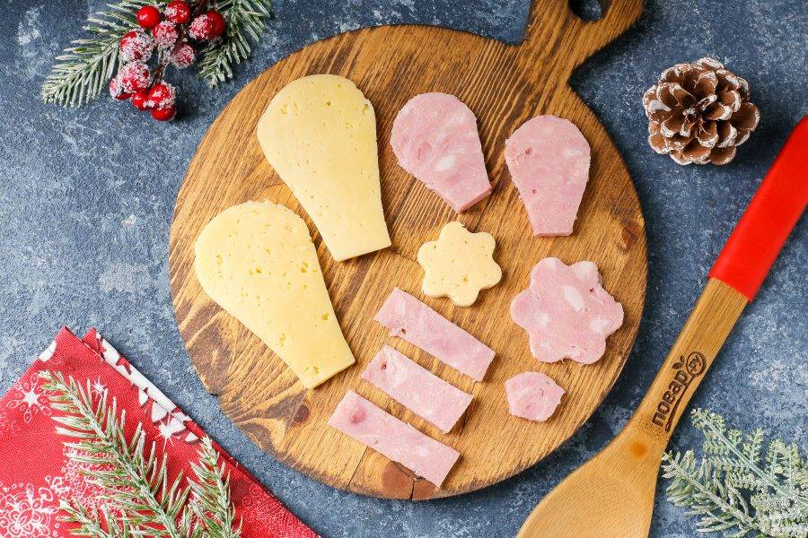 Из остатков сыра вырежьте ушки кролика и другие элементы декора. Я вырезала при помощи формочки для печенья цветок. Из ветчины так же вырежьте элемент для украшения и ушки, они должны быть немного меньше, чем сырные. Оставшуюся ветчину нарежьте полосками, шириной около 1 см. и длиной по размеру шеи кролика.